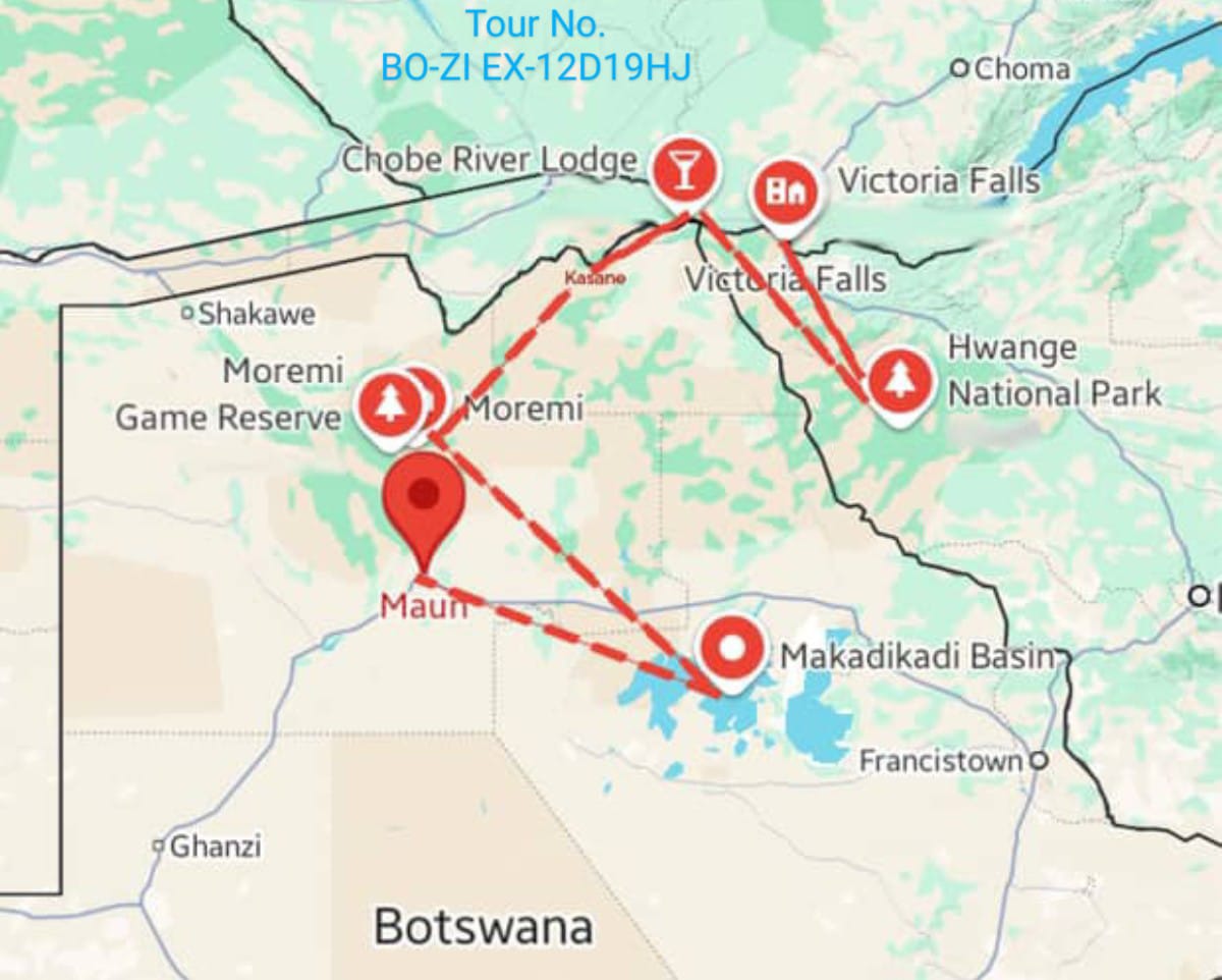 Maun – Makgadikgadi Pans – Moremi – Kasane – Hwange National Park – Victoria Falls (Zimbabwe)
