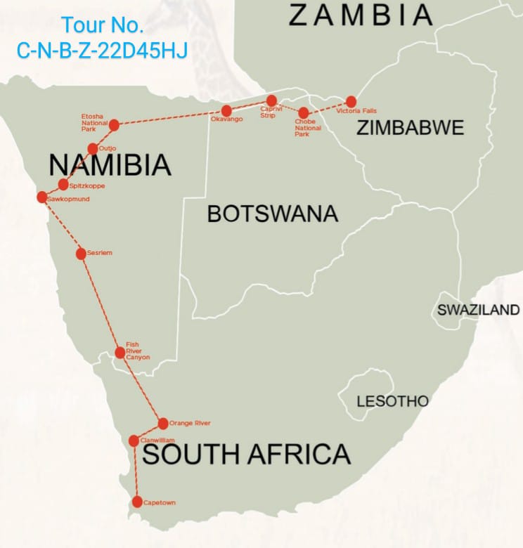 Cape Town β Clanwilliam β Orange River β Fish River Canyon β Sesriem β Sossusvlei β Swakopmund β Spritzkoppe β Outjo β Etosha NP β Okavango Region β Caprivi Strip β Chobe NP β Vic Falls