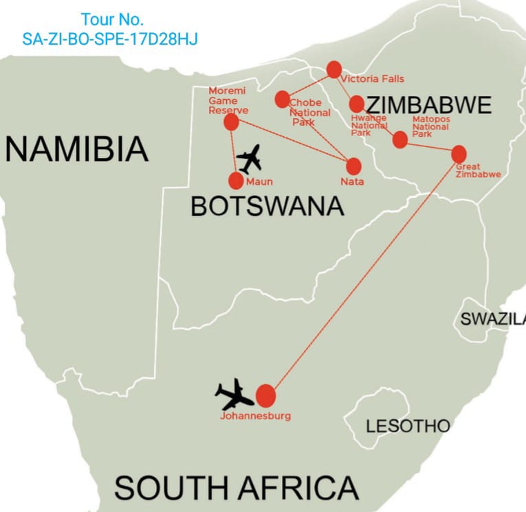 Johannesburg – Mapungubwe National Park – Great Zimbabwe Ruins – Matobo National Park – Hwange National Park – Victoria Falls – Chobe National Park – Nata – Moremi – Maun